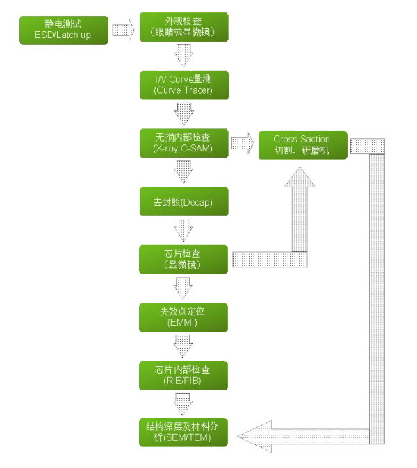 半導(dǎo)體器件的失效分析流程,國際國內(nèi)公認(rèn)的方法是從非破壞性試驗(yàn)手段到破壞性試驗(yàn)手段